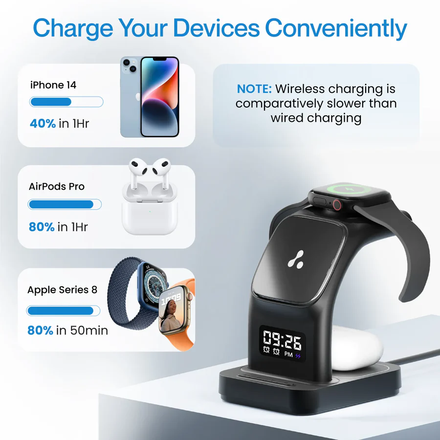 - Versatile Charging: With wireless output options ranging from 5W to 15W, you can charge your mobile device at the optimal speed. Additionally, it provides a dedicated 2.5W wireless output for your Apple Watch and 5W for your AirPods.