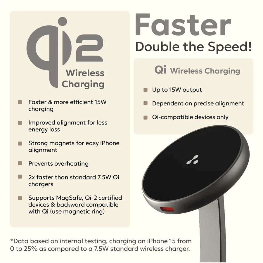 - Compatibility: iPhone 12 and above (MagSafe and Qi2-enabled phones), Qi-enabled devices