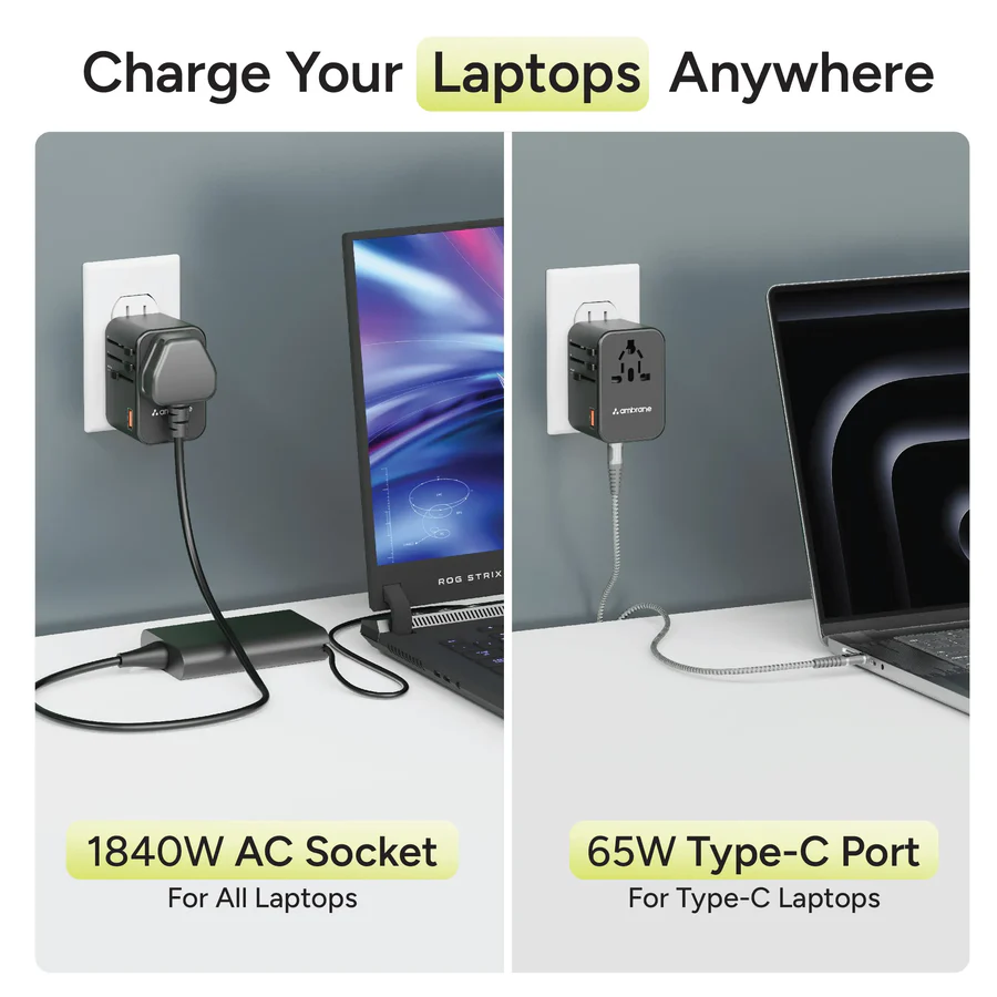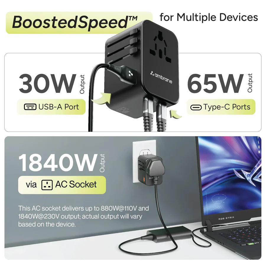 • Versatile Charging Options: Featuring two USB-C ports (C1/C2) providing 65W, one USB-A port offering 30W, and an AC output socket supporting up to 1840W at 230V, the adapter is designed to charge everything from smartphones to laptops. This versatility makes it an essential travel companion.