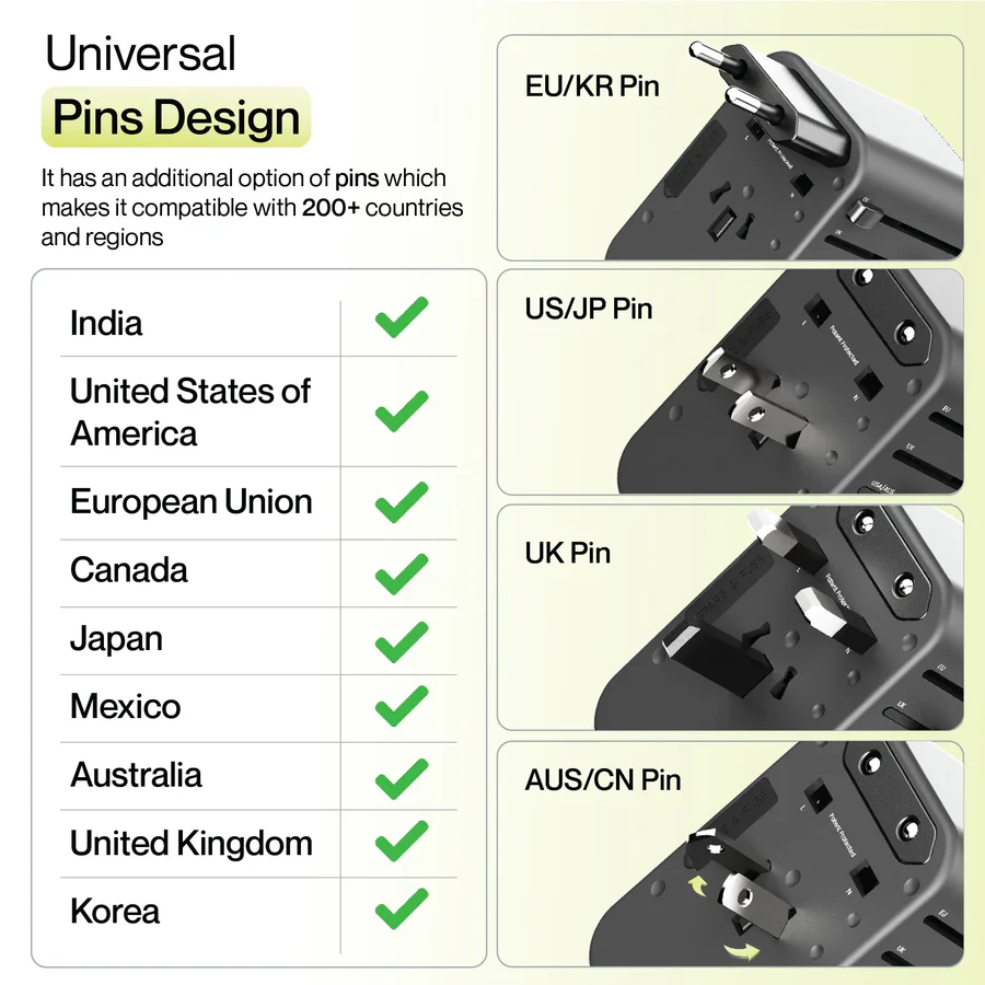 • Pin Compatibility: US, UK, AUS, EU (changeable pins)
