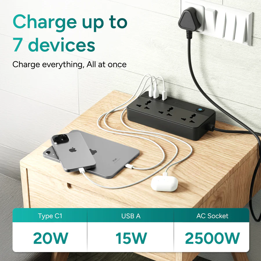 - Master Powerstrip: Power up to 7 devices all at once with 3 USB-A ports, 3 AC sockets, and one Type-C port.