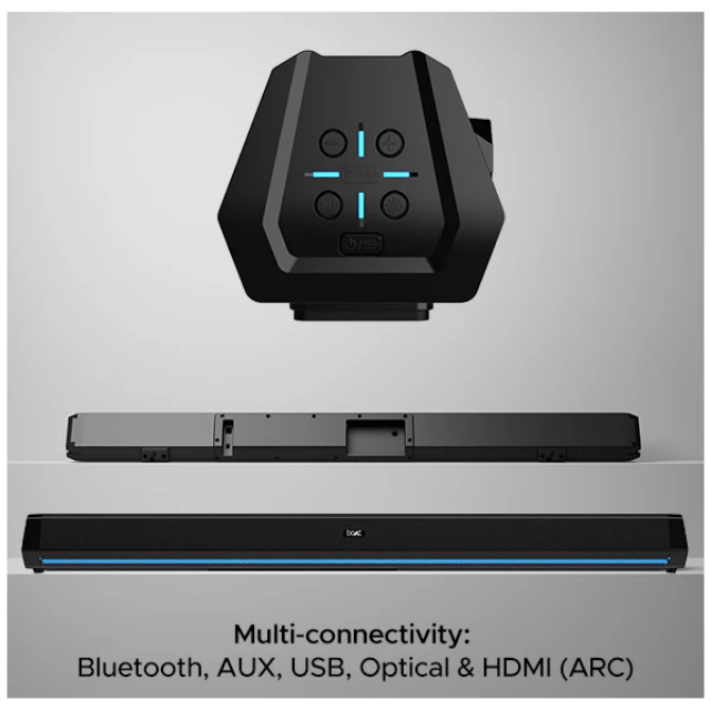 - Multi-port Connectivity: Includes USB, AUX (3.5 mm), Optical and HDMI (ARC) options, making it simple to connect a wide range of devices — from smart TVs and set-top boxes to DVD/Blu-ray players and game consoles.