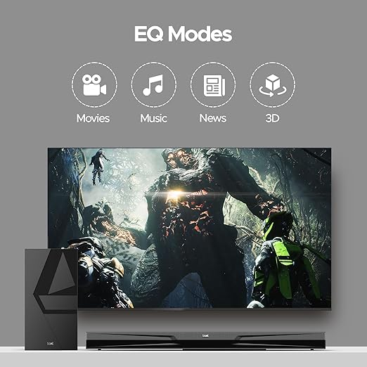 - EQ Modes: Dive into tailored audio with this soundbar’s dedicated entertainment EQ modes, like Movies, Music, News, and 3D. Immerse yourself in movies or explore new music albums with powerful sound for company.