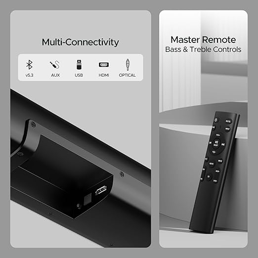 - Multichannel Connectivity (BT v5.3, AUX, USB, Optical, HDMI-ARC): Choose from wireless Bluetooth v5.3 or any one of the ports -AUX, USB, HDMI-ARC, optical – to connect your device and relax to your playlist.