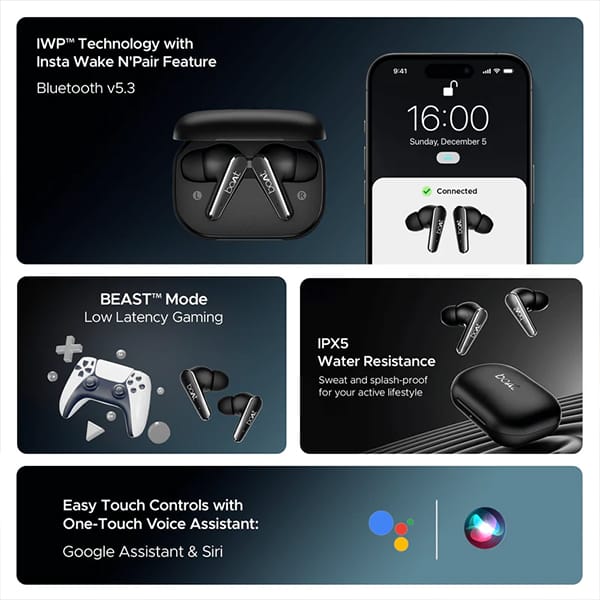 • Insta Wake N’Pair (IWP): Plug in your earbuds and you’re instantly connected to the audio with IWP. No more connection delays while listening to podcasts, watching web series, or reliving your comfort movies with Airdopes 280 ANC by your side!