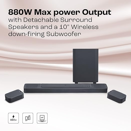 - TRULY WIRELESS SOUNDBAR: JBL Bar 1000 Pro is a Truly Wireless Soundbar with a Wireless Subwoofer, two up-firing drivers in the main bar, and two detachable battery-powered Wireless Rear speakers