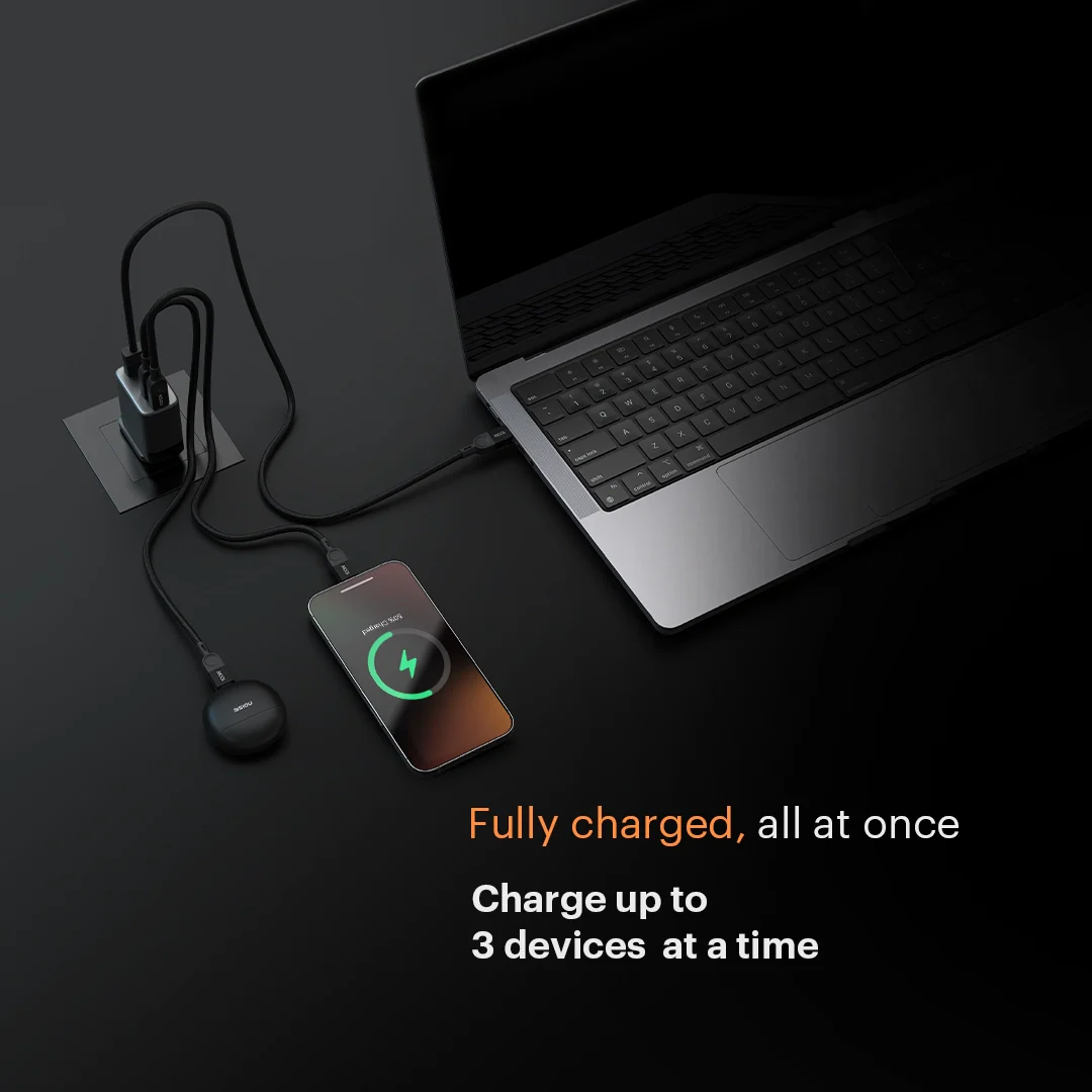 • Features three output ports2 × USB-C + 1 × USB-A — so you can charge multiple devices simultaneously.