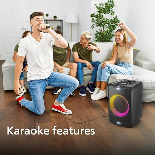 • Fine-Tuned Sound Controls: Adjust bass, treble, mic volume, echo, vocal fader, and even voice changer for custom audio and karaoke effects directly from the speaker.